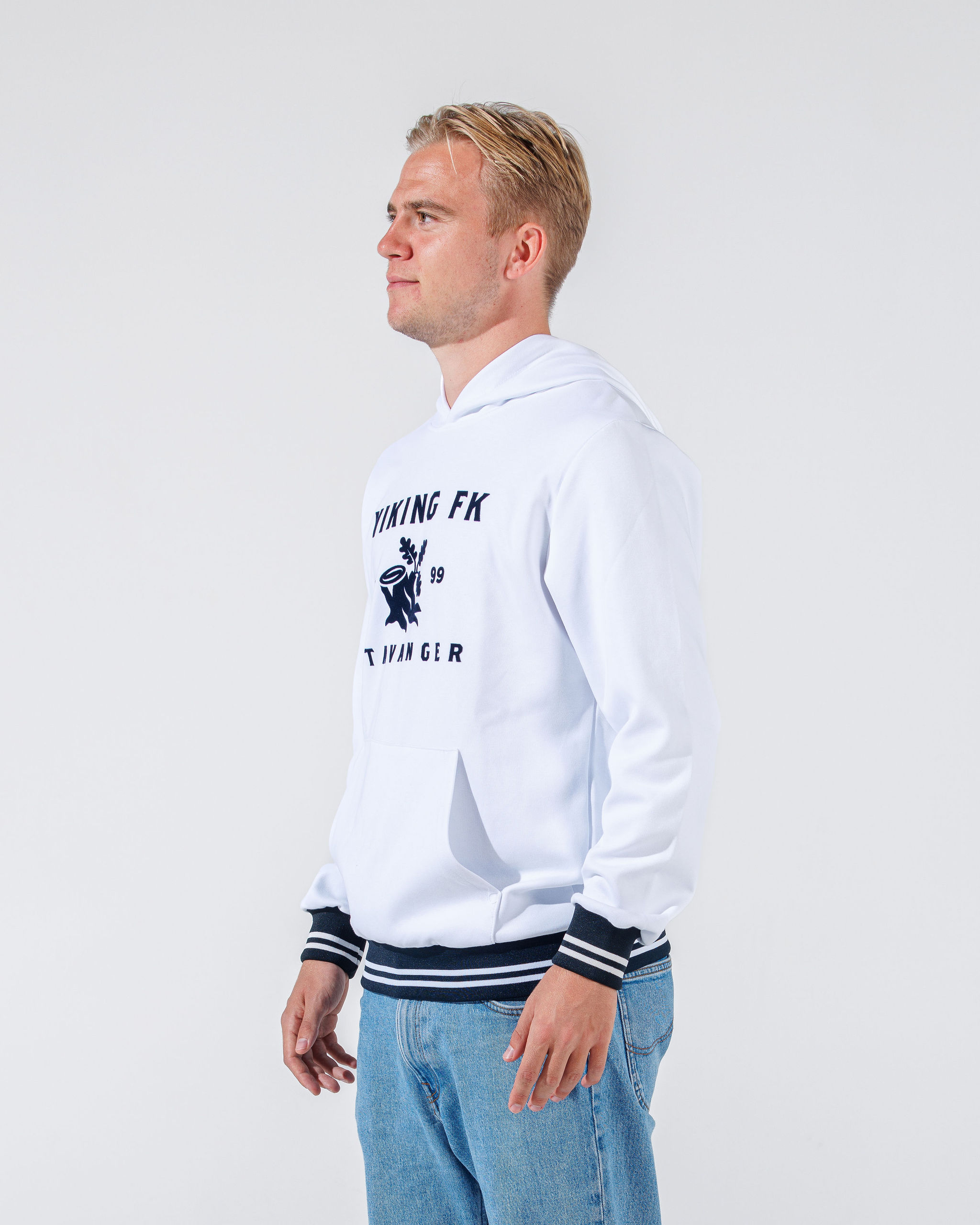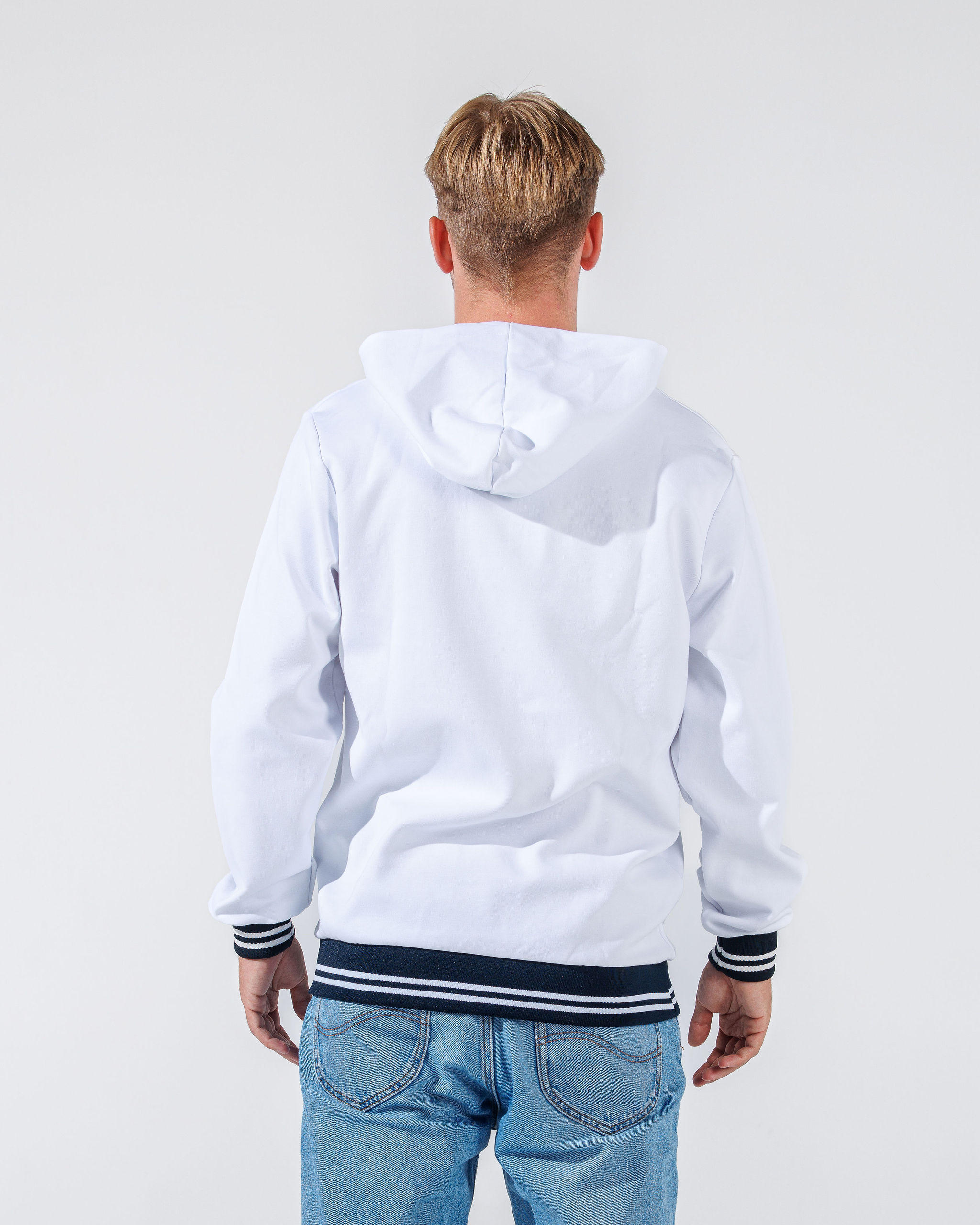 Tøff hettegenser med flocktrykket logo i front. Genseren har tidsriktig mote og er laget i en bomull/polyester miks. Striper på ribben på ermene og nede på genseren.
