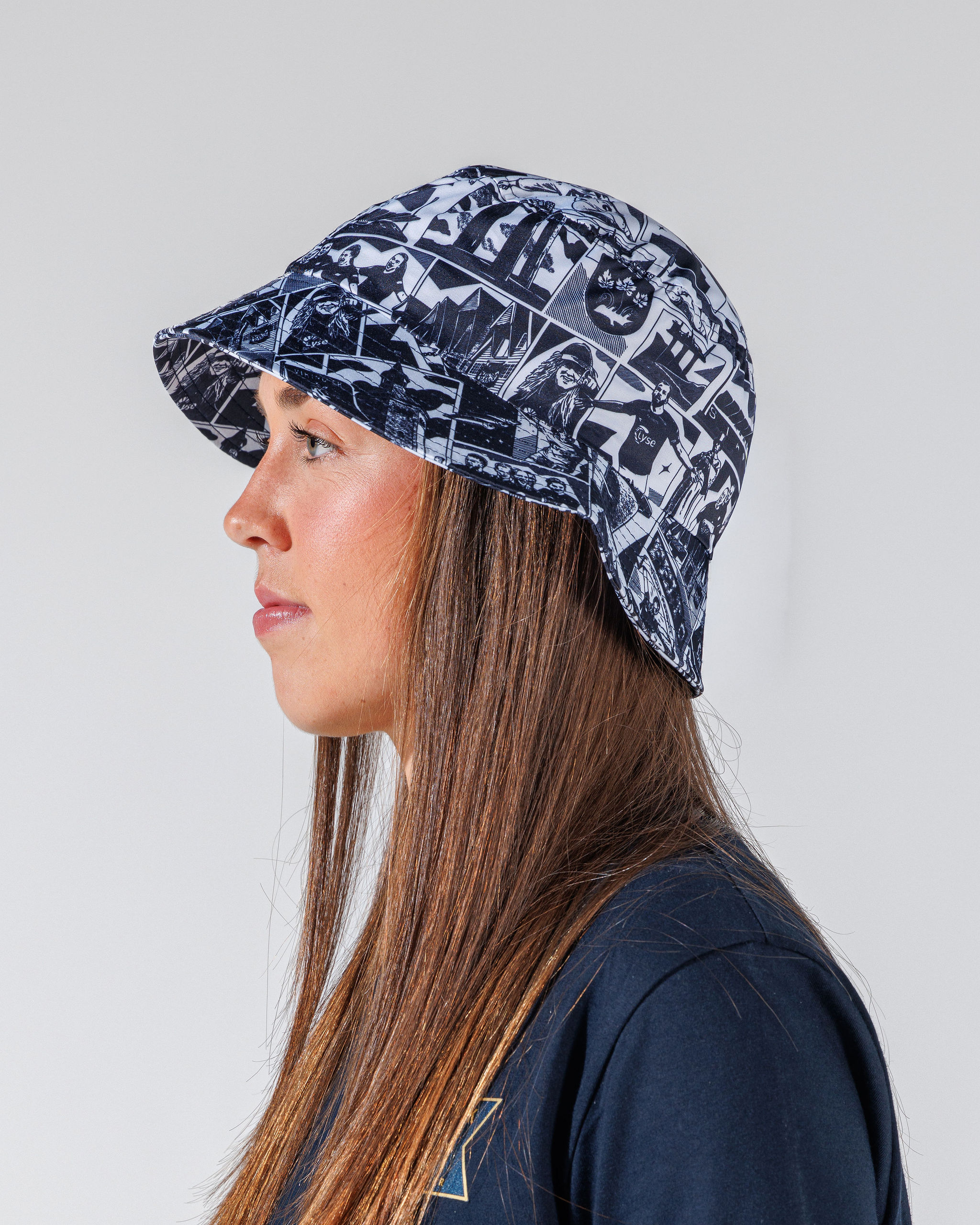 Bøttehatt hvit/blå collage